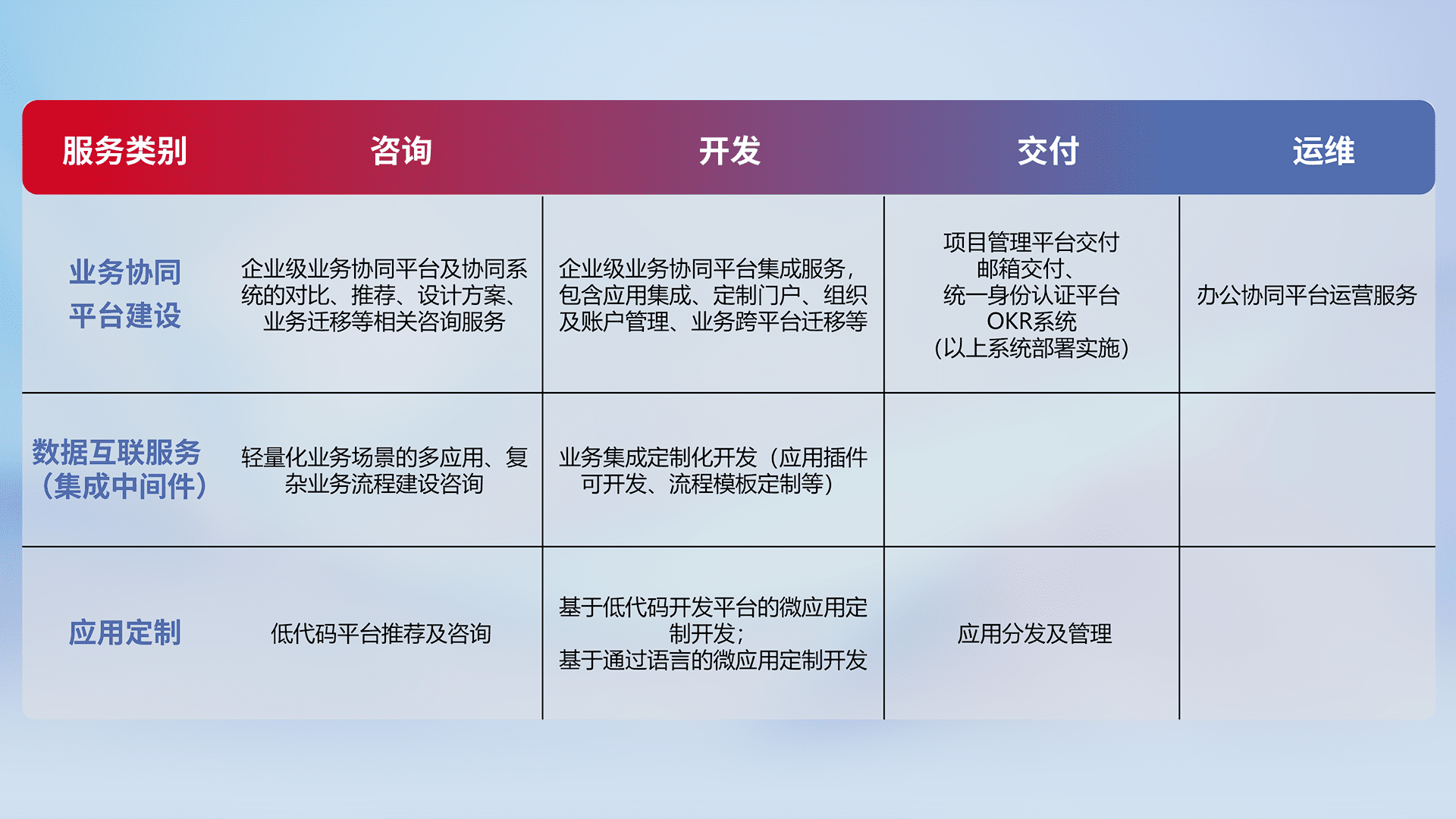 针对钉钉、、企微、、、、IDaas等平台级产品提供产品的规划、、方案、、、、交付、、、、定制化开发等服务,,,,实现如统一协同办公、、智能客户服务、、混合会议管理、、、智能数据查询、、、等业务场景,,,实现数字化转型。。。